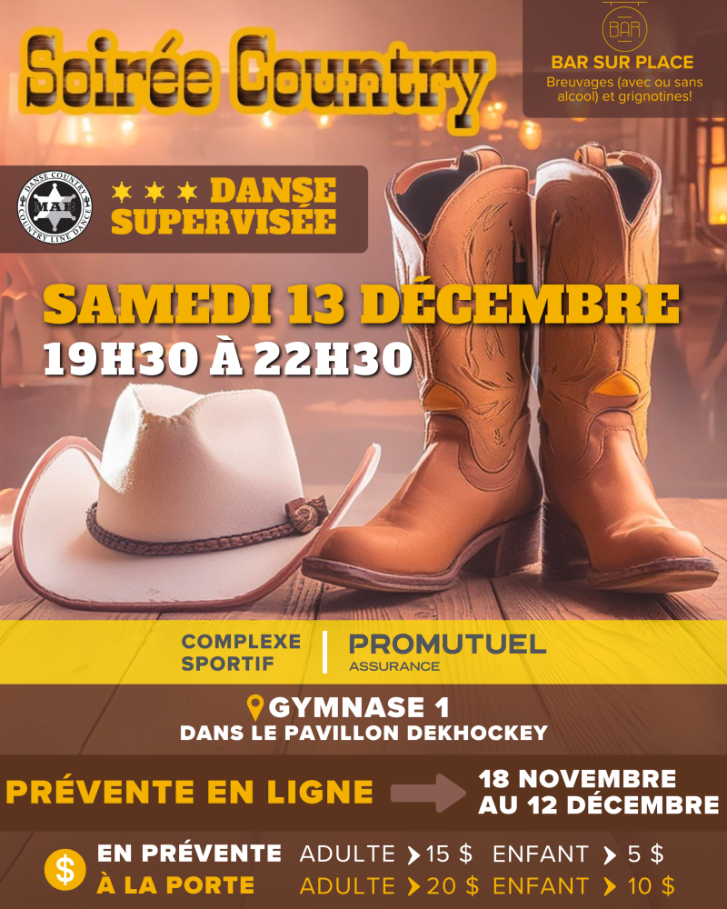 Ne manquez pas notre Soirée Country le 13 décembre prochain ! On vous attend !