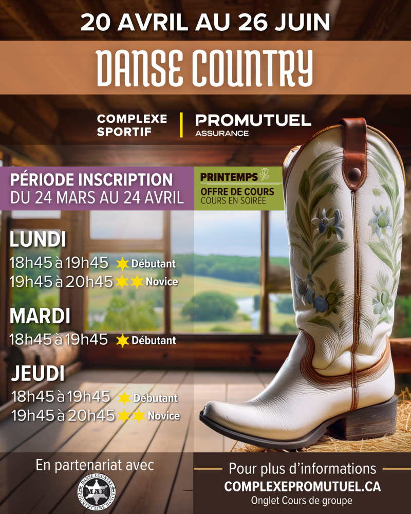Amateurs de musique country, de danse et de bonne ambiance, réservez votre soirée du 11 avril ! Le Complexe sportif en partenariat avec Danse Country MAB vous offre une soirée country hors du commun