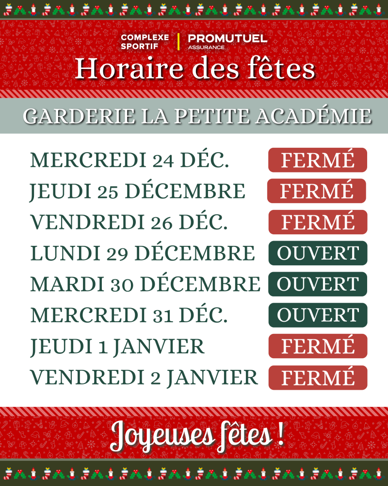 Contrairement aux autres activités du Complexe, la garderie ouvrira ses portes durant une partie des vacances des fêtes (29, 30 et 31 décembre).