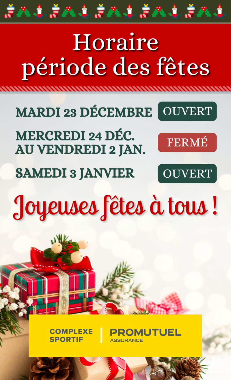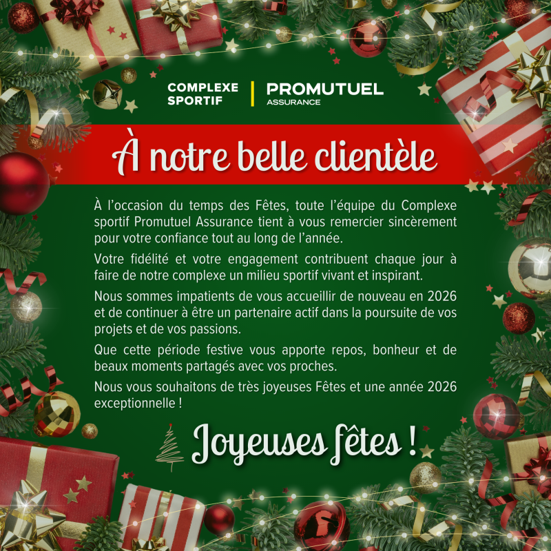 Le Complexe sportif Promutuel Assurance profitera de la période des Fêtes pour une courte pause. Nous vous invitons à consulter l’horaire ci-dessous pour connaître les dates de fermeture et de reprise des activités.